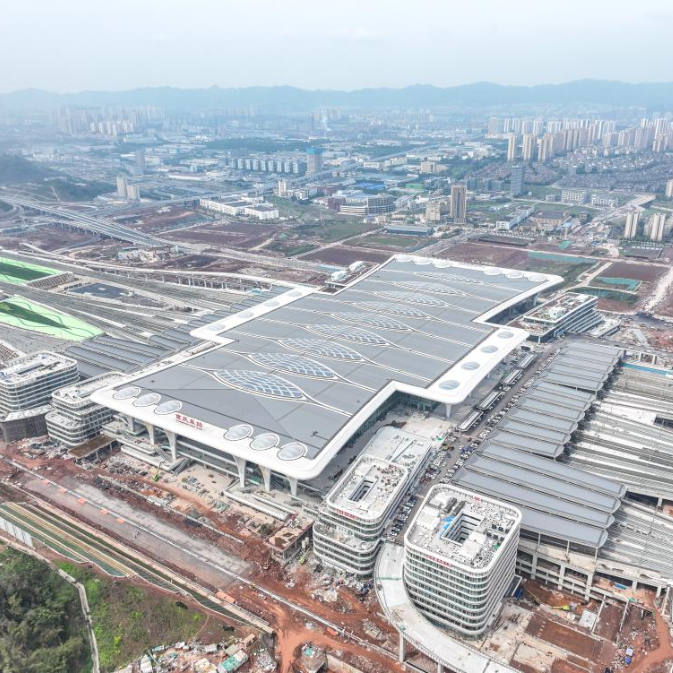 这是3月19日拍摄的重庆东站,该站站房于当日建成完工(无人机照片)。
