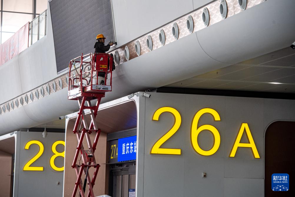 这是3月19日拍摄的重庆东站候车大厅,建设工人在进行完工后的收尾工作。