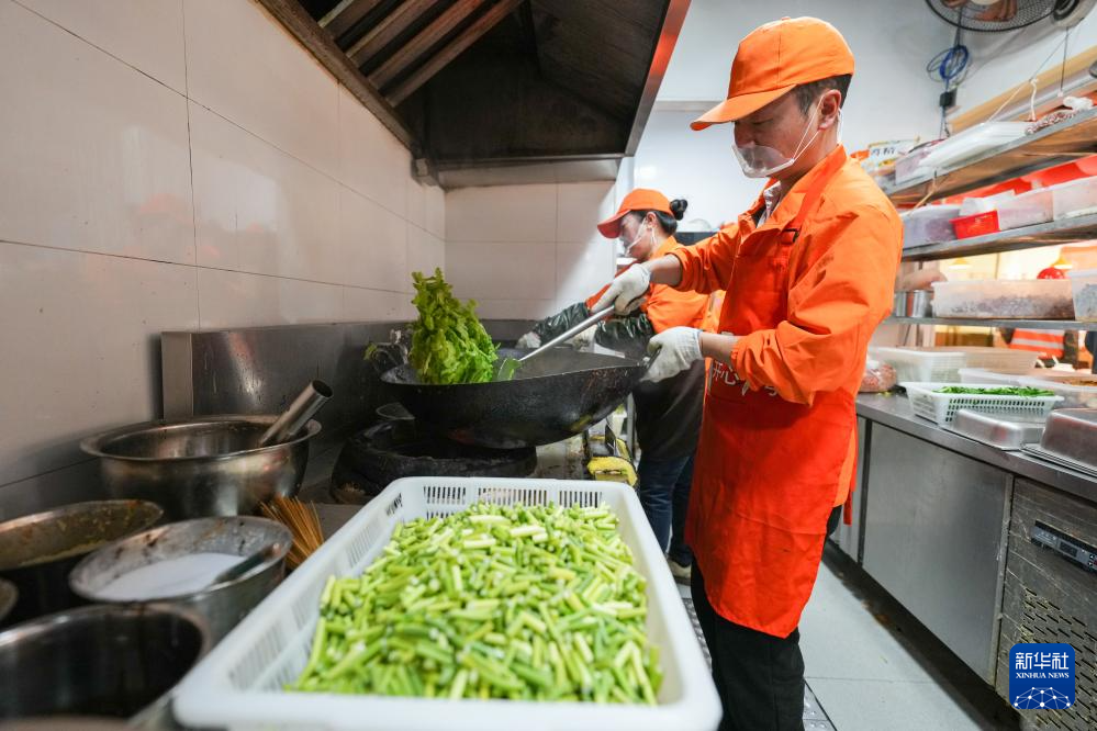 3月19日,在湘潭市雨湖区和平街道杉山社区食堂,工作人员在炒菜。