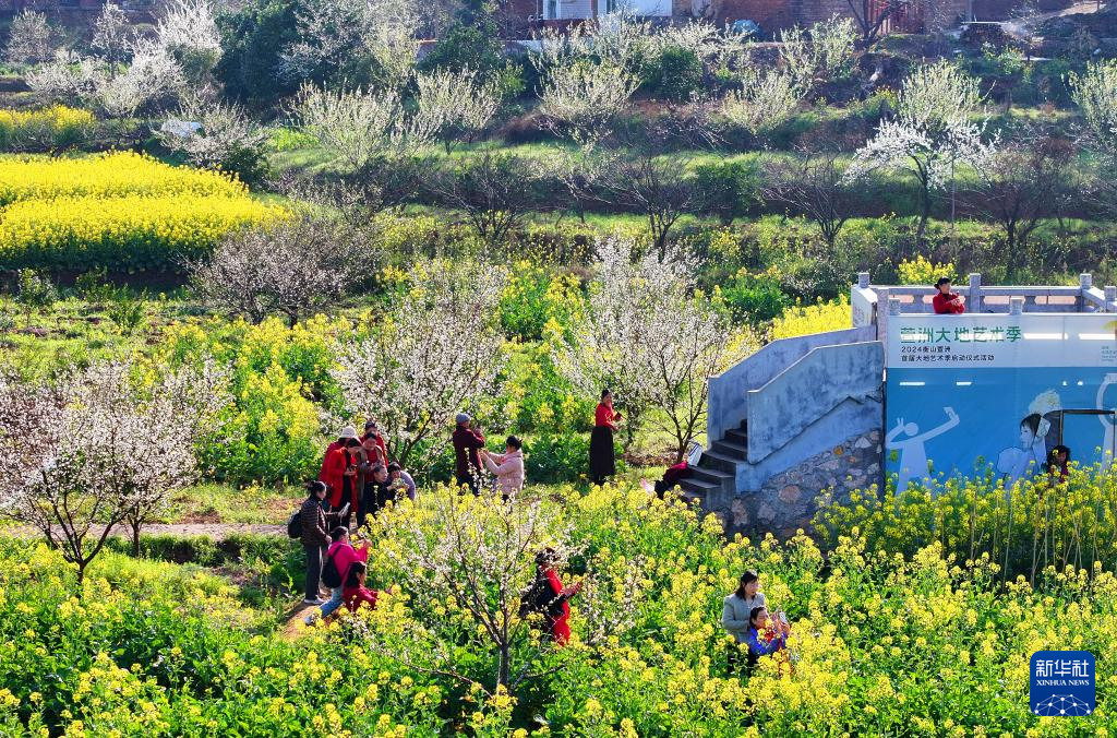 3月18日,游客在湖北省宣恩县长潭河侗族乡甘露梯田的油菜花间赏花游玩。