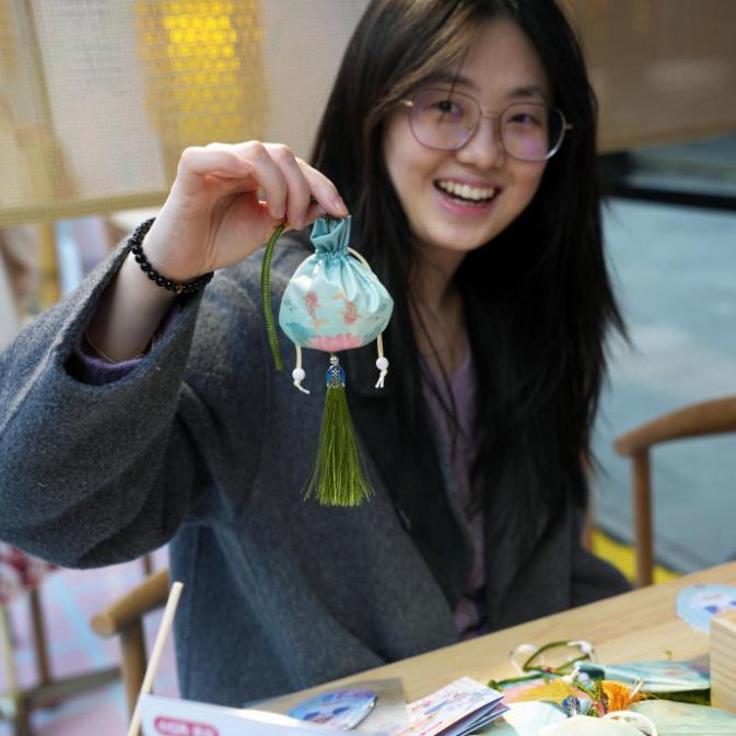 3月20日,游客在豫园商城的国潮市集上体验手作香囊。