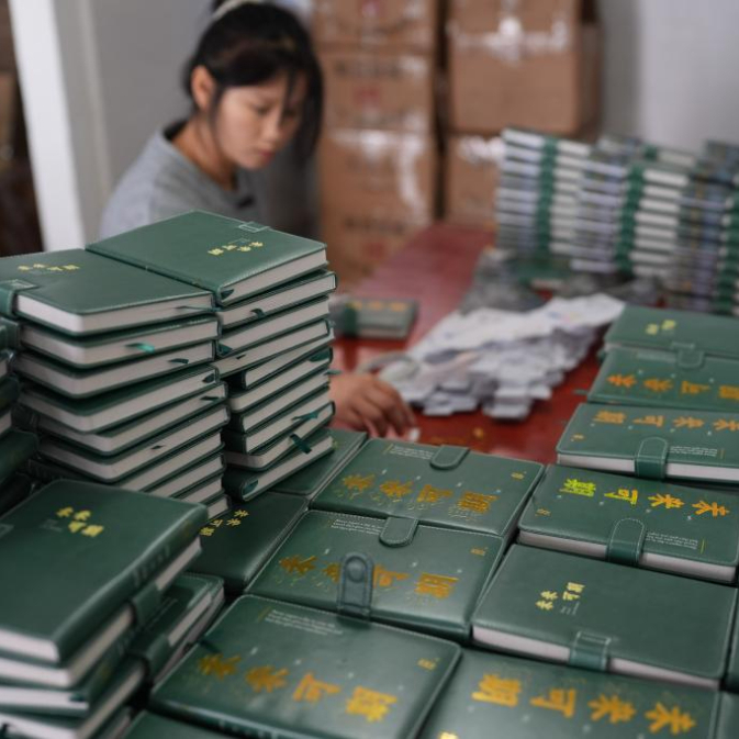 3月20日,工作人员在宁波素年工艺品有限公司生产车间包装一款文创笔记本。
