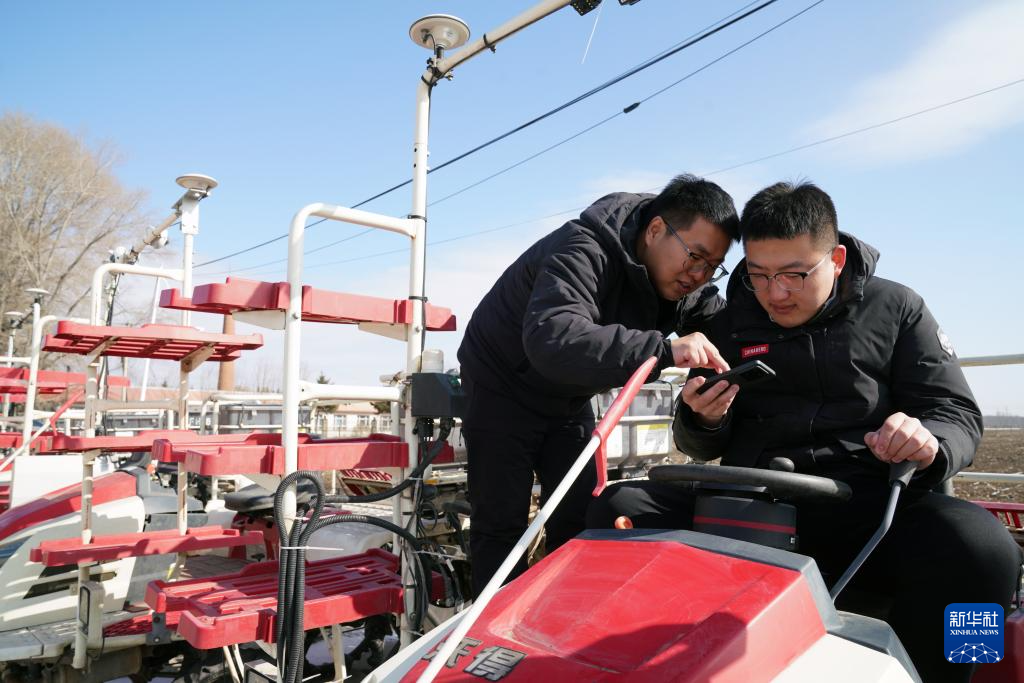 在位于双鸭山市的黑龙江北大荒农业股份有限公司友谊分公司,工作人员在维护无人驾驶插秧机智能系统(3月19日摄)。