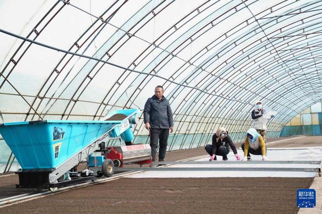 在位于双鸭山市的黑龙江北大荒农业股份有限公司友谊分公司水稻育秧大棚,种植户在进行秧盘摆盘与覆土作业(3月19日摄)。