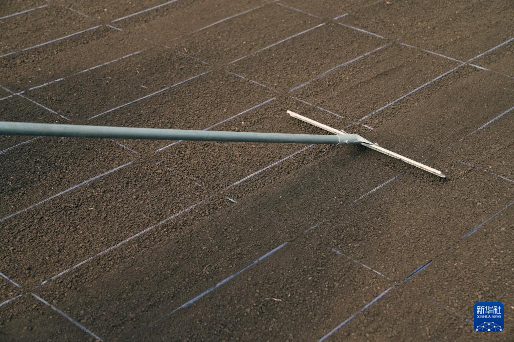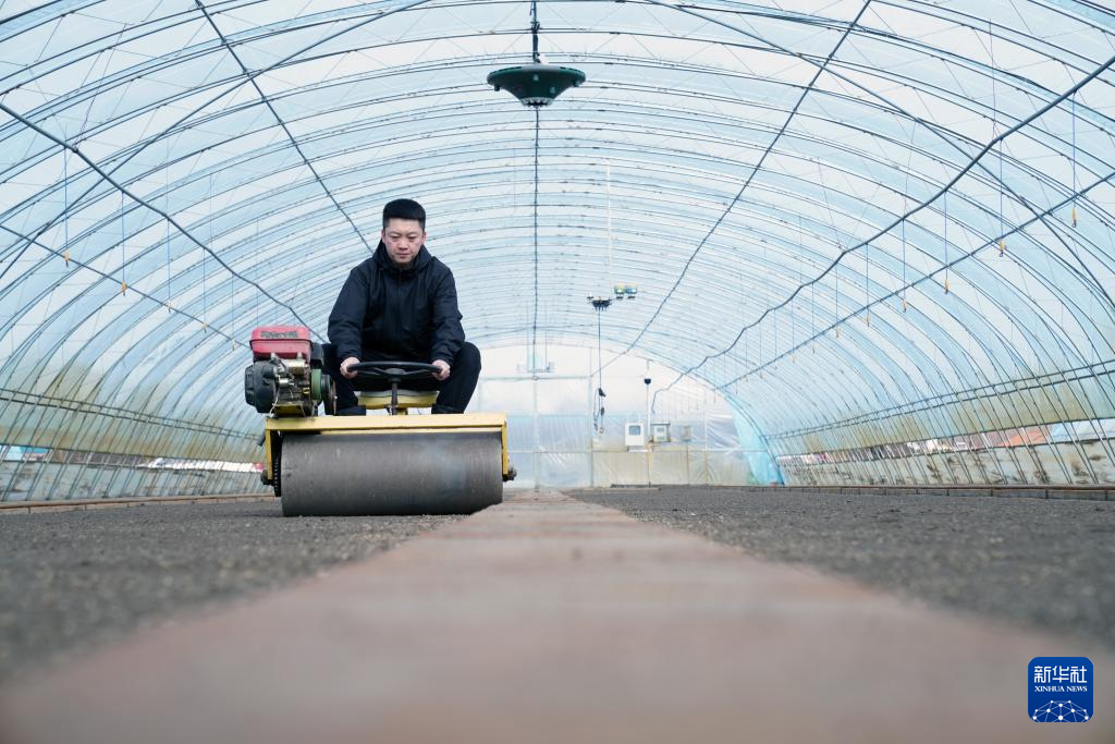 在位于双鸭山市的黑龙江北大荒农业股份有限公司友谊分公司水稻育秧大棚,种植户在平整育秧用土(3月19日摄)。
