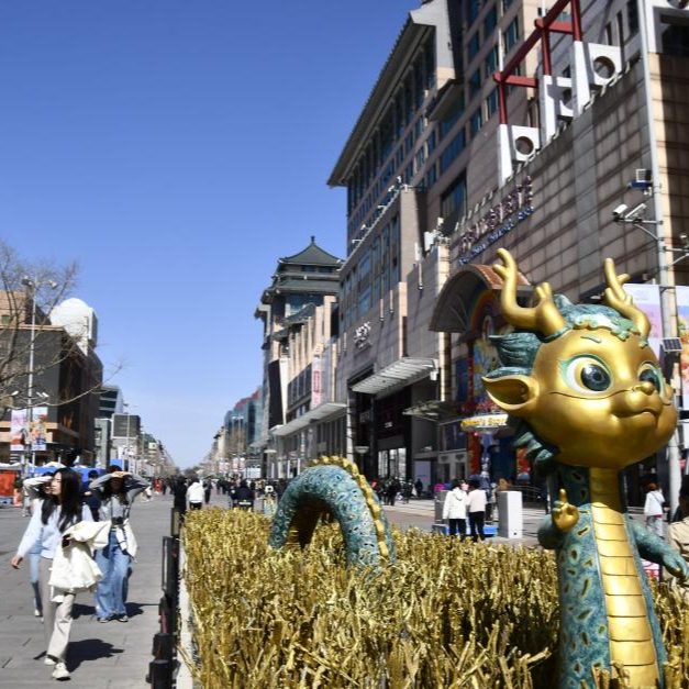 3月20日,人们从北京王府井商业街区的裸眼3D大屏前走过。