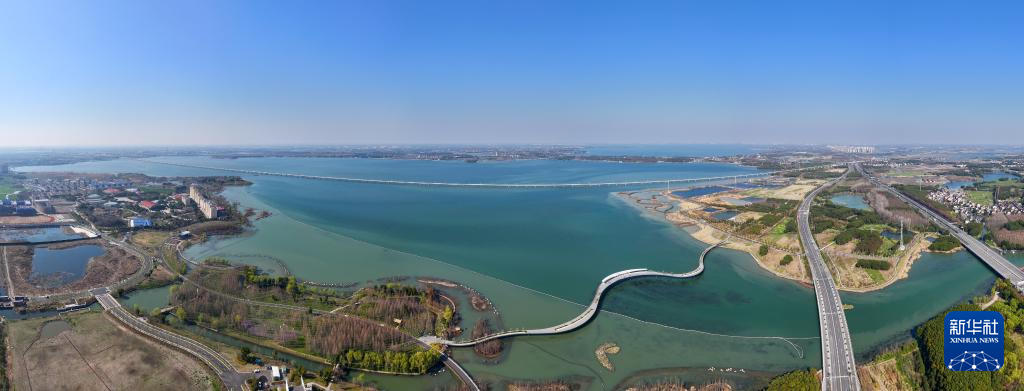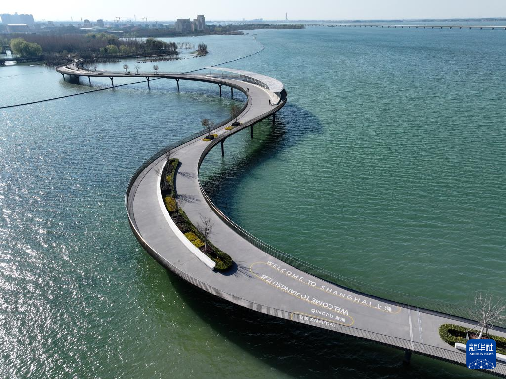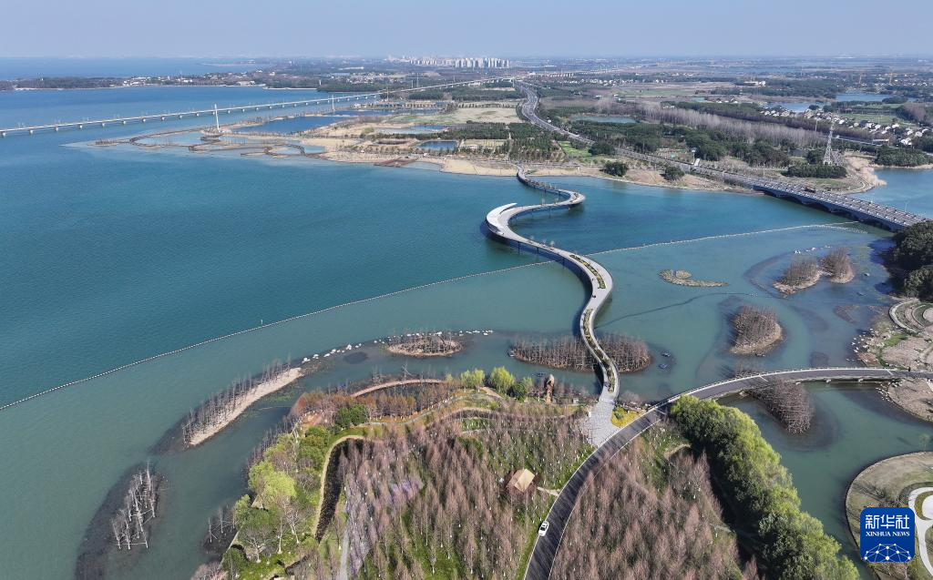元荡慢行桥横卧元荡湖,连接江苏吴江和上海青浦两地(3月17日摄,无人机照片)。这片省际交界水域水质安全曾经处于失管状态,通过共保联治,如今成为网红打卡地。