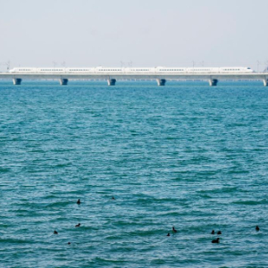 水禽在元荡湖栖息,不远处动车组列车疾驰而过(3月17日摄)。这片省际交界水域水质安全曾经处于失管状态,通过共保联治,如今成为网红打卡地。