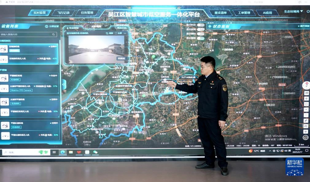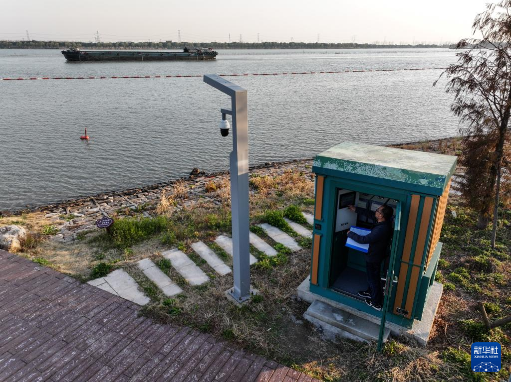 3月17日,在江苏吴江太浦河驿站,当地生态环境部门工作人员介绍无人机巡航情况。吴江打造“太浦河云管家”智慧管理平台,通过无人机巡航、智慧卡口监控等,精准采集监测数据。