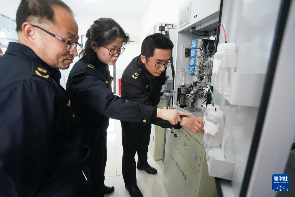3月18日,在吴江一家工业污水处理厂,来自江苏吴江、上海青浦、浙江嘉善的生态环境部门执法人员检查出水监测设备运行情况。