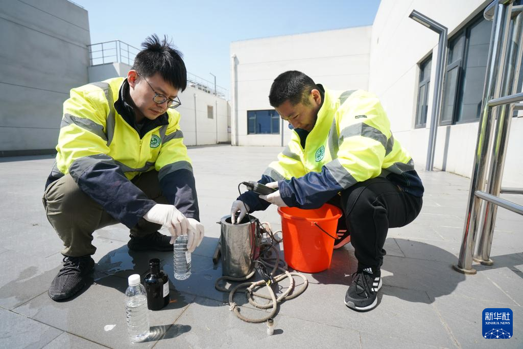 3月18日,在吴江一家工业污水处理厂,苏州市吴江环境监测站工作人员对排放废水进行采样监测。
