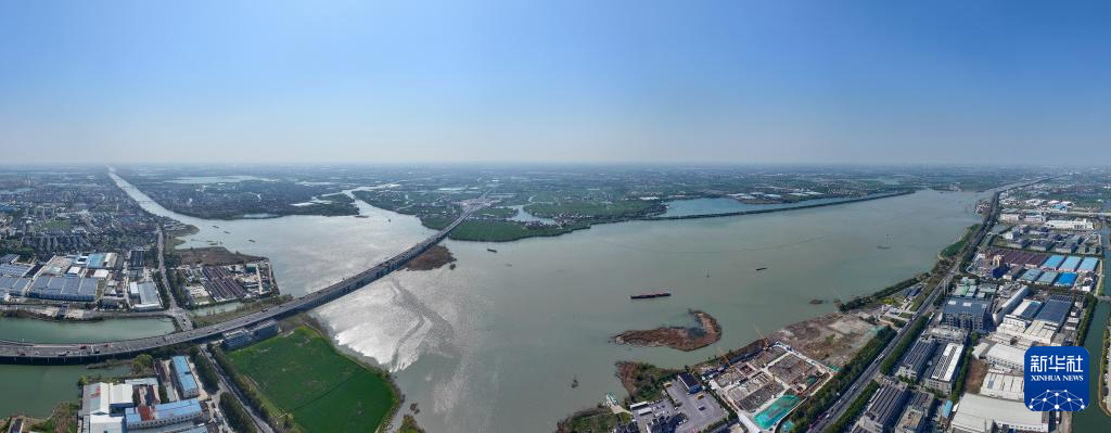 在江苏吴江拍摄的太浦河风景(3月18日摄,无人机照片)。太浦河西起太湖、东至黄浦江,是长三角生态绿色一体化发展示范区内的重点河流。