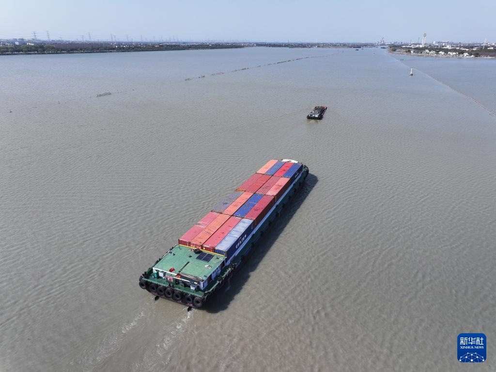 货船行驶在太浦河汾湖段(3月18日摄,无人机照片)。太浦河西起太湖、东至黄浦江,是航运黄金水道。