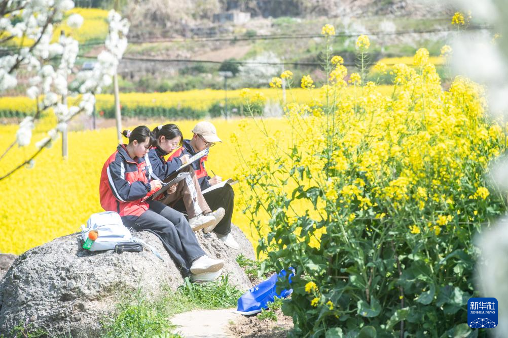 3月20日,巫山县福田镇的学生在油菜花田里写生。
