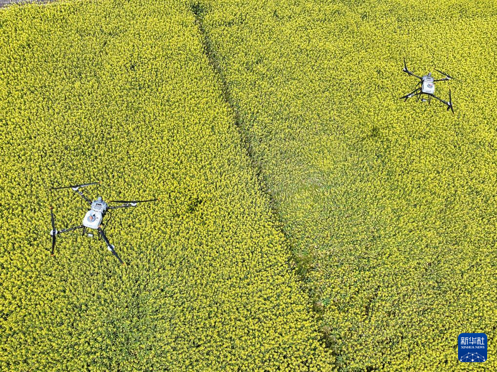 3月20日,无人机在巫山县福田镇油菜花田上空进行植保作业(无人机照片)。