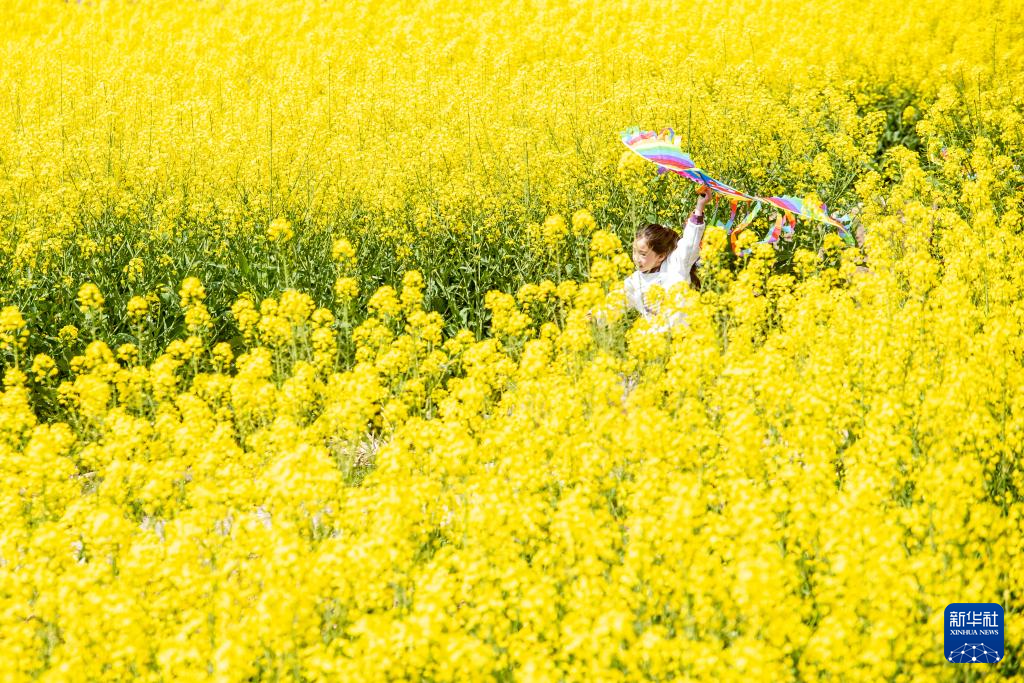 3月20日,小朋友在巫山县福田镇的油菜花田里放风筝。