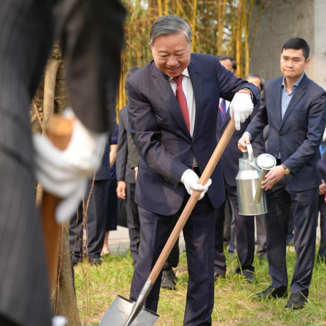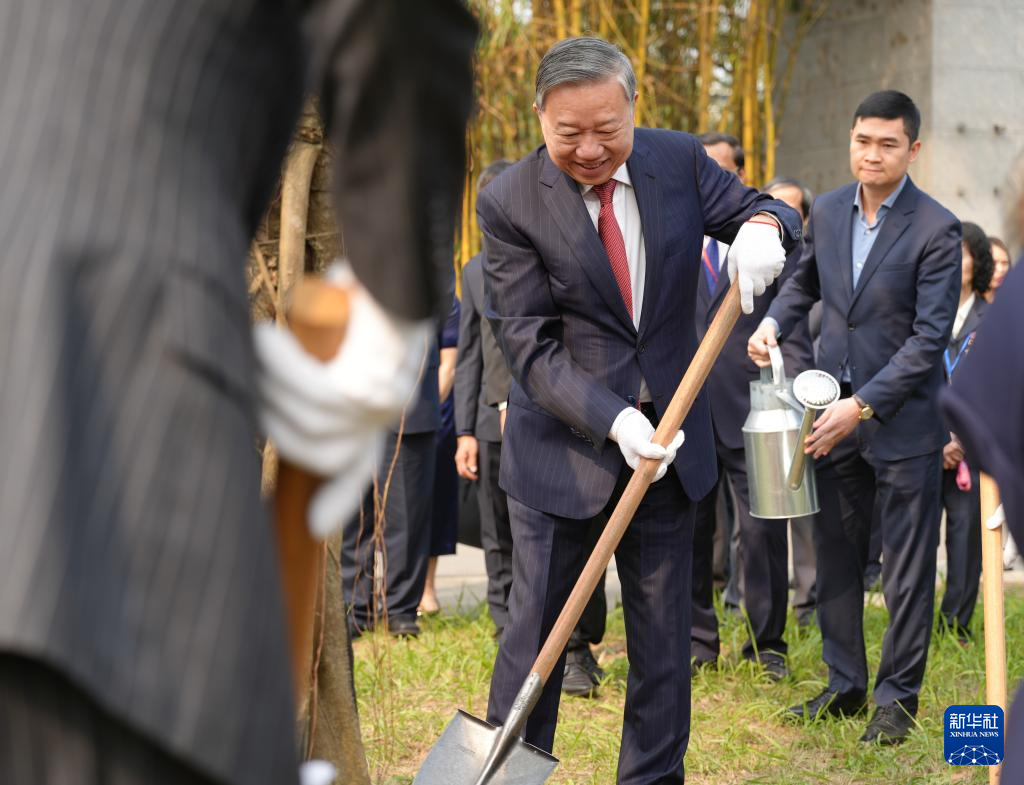 3月20日,越共中央总书记苏林(中)在首都河内的越中友谊宫栽植“越中人文交流树”。