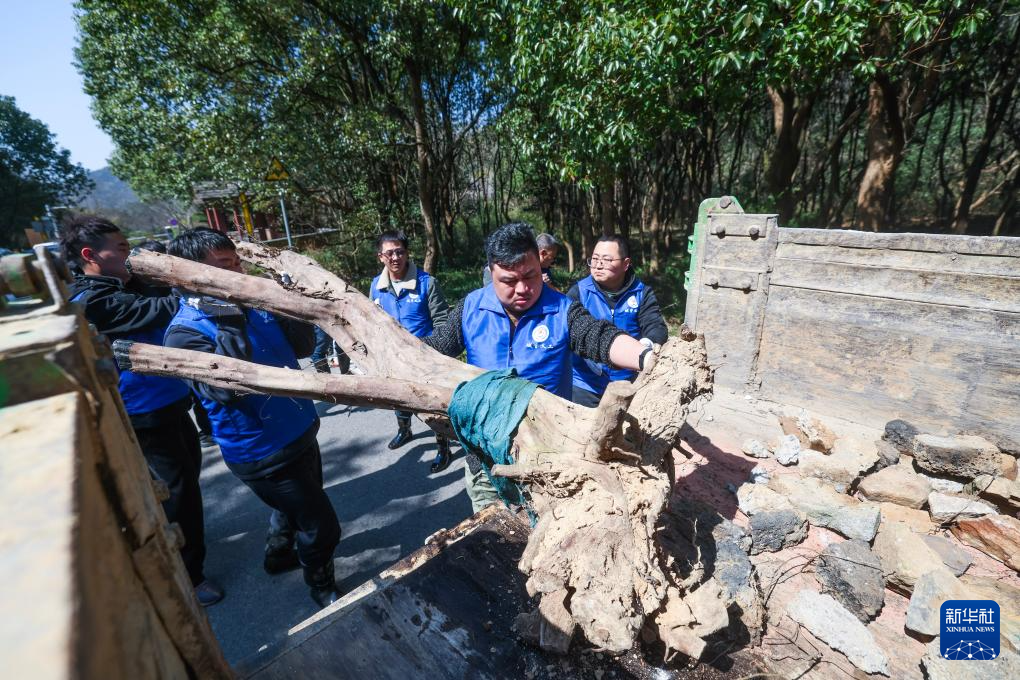 3月21日,湖州吴兴区城管义工在梁希国家森林公园内清理垃圾。