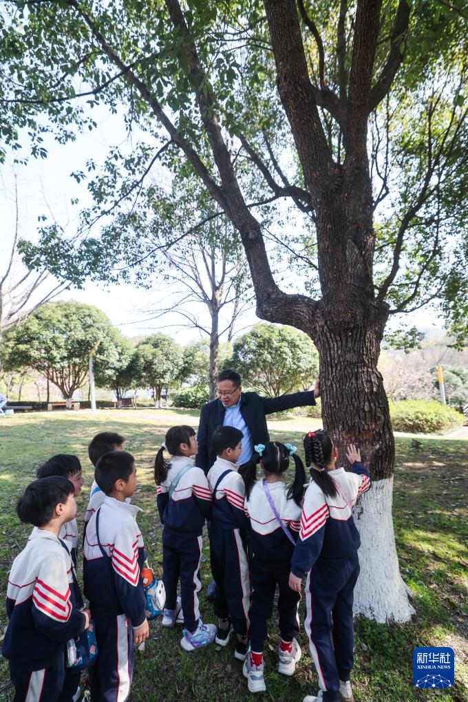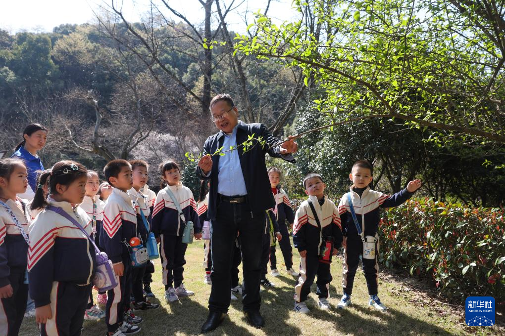 3月21日,林业专家(中)在梁希国家森林公园内给湖州浮玉幼儿园的小朋友介绍不同树木的特征和生长规律。