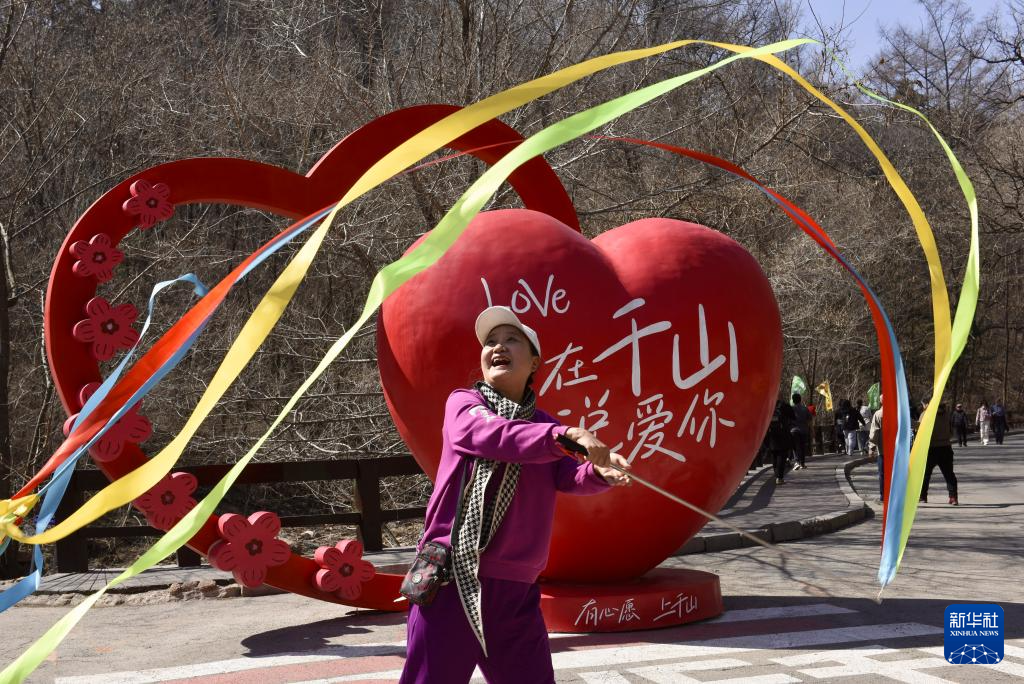 3月21日,一名游客在千山景区舞动彩带拍照留念。