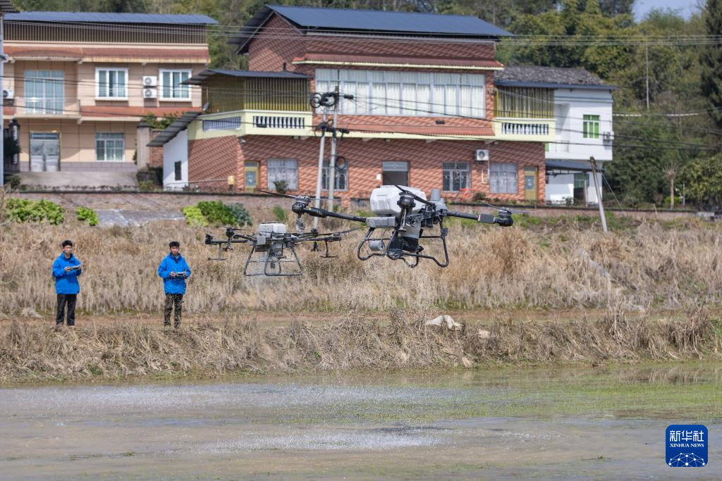 3月20日,在重庆市梁平区屏锦镇万年社区,重庆市味源现代农业专业合作社的技术人员操作植保无人机喷洒营养液。