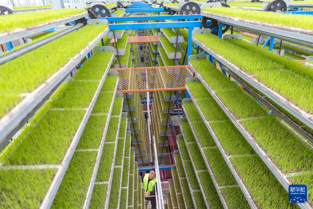 3月19日,在重庆市永川区仙龙镇双星村智能育秧基地,技术人员在育秧育苗区查看秧苗的生长情况。