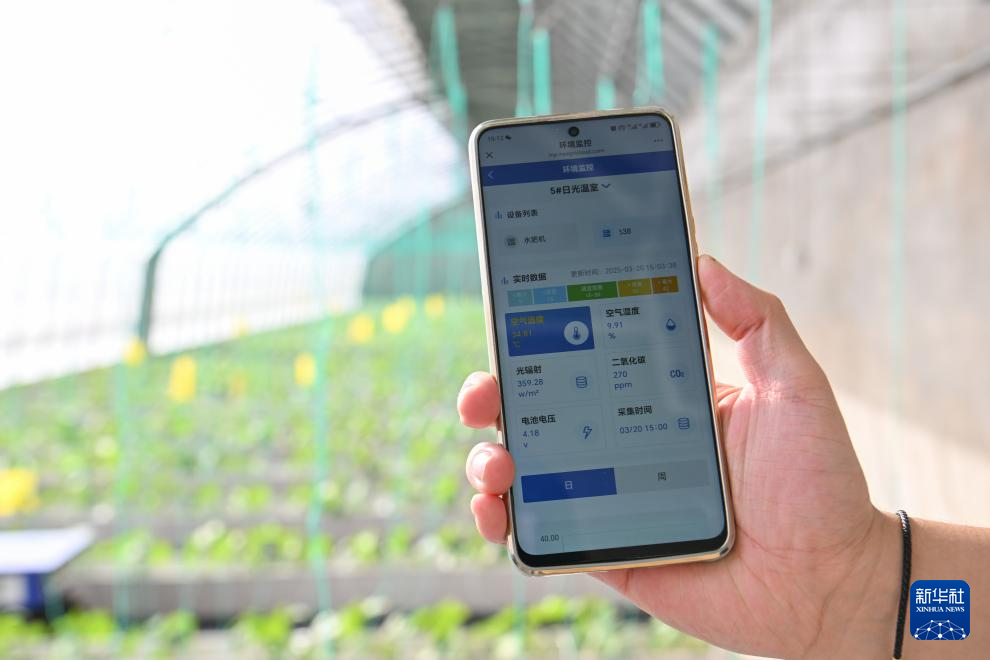 在农芯科技(天津)有限责任公司智慧农业园区,科研人员通过手机实时查看温室内的环境数值(3月20日摄)。