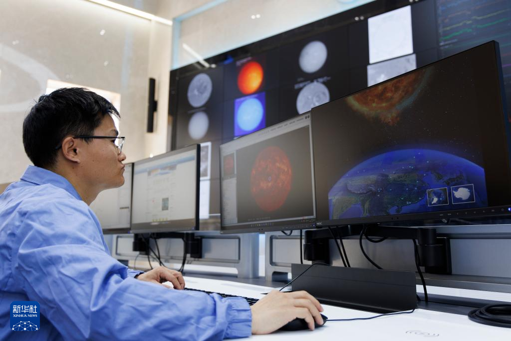 3月20日,在位于北京怀柔的子午工程综合信息与运控中心大楼,一名科研人员在空间环境预报中心监测太阳活动。