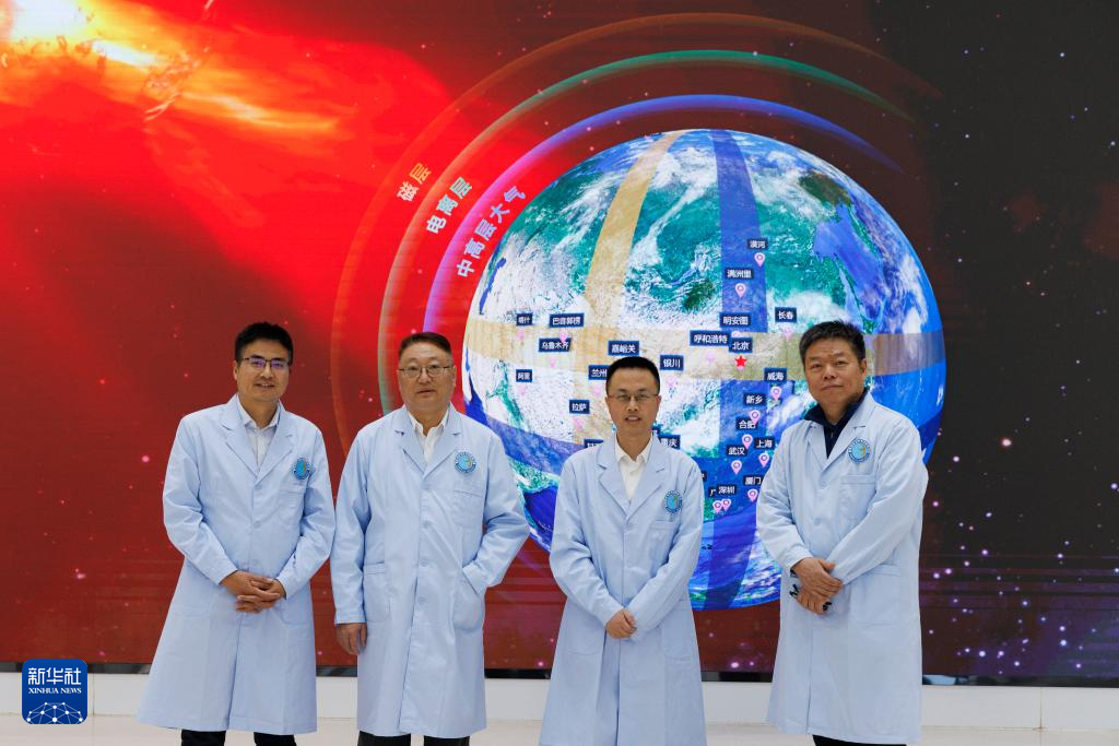 3月20日,在位于北京怀柔的子午工程综合信息与运控中心大楼,中国科学院国家空间科学中心子午工程中心主任李晖(左三)、子午工程二期总工程师徐寄遥(左二)、太阳活动与空间天气重点实验室副主任罗冰显(左一)、圆环阵太阳射电成像望远镜主任设计师阎敬业合影。