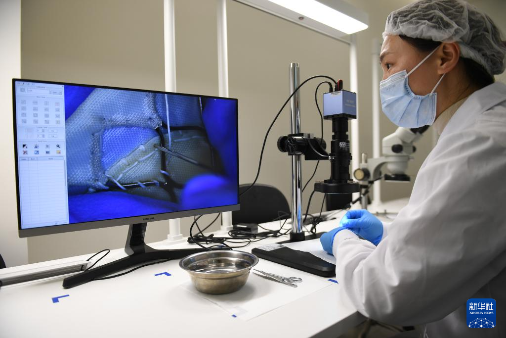 3月21日,在位于苏州工业园区的沛嘉医疗科技(苏州)有限公司,生产人员借助电子显微镜缝制人工心脏瓣膜。