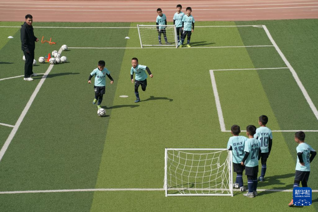 3月21日,在西安市曲江第六小学,足球队员在体育课上进行攻防练习。