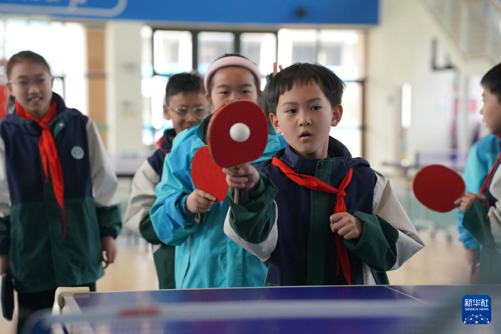 3月21日,在西安市曲江第六小学,学生在体育课上练习乒乓球。