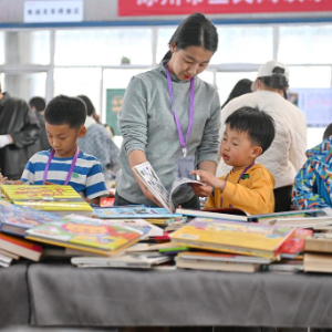 3月22日,家长带着孩子在书市上挑选图书。