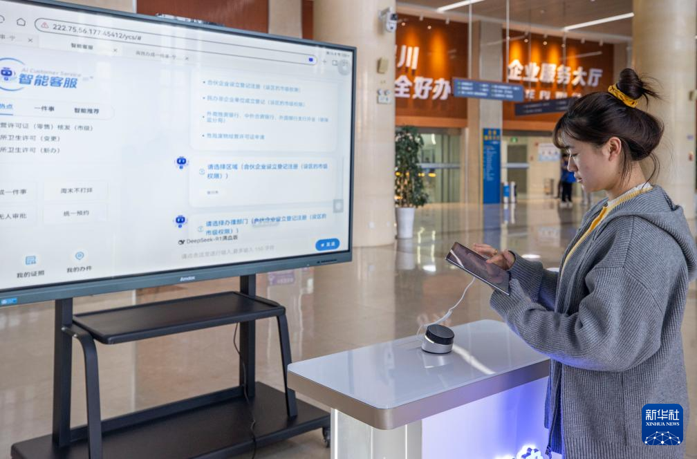 3月21日,办事人员在银川市审批服务管理局企业服务大厅使用智能客服查询信息。