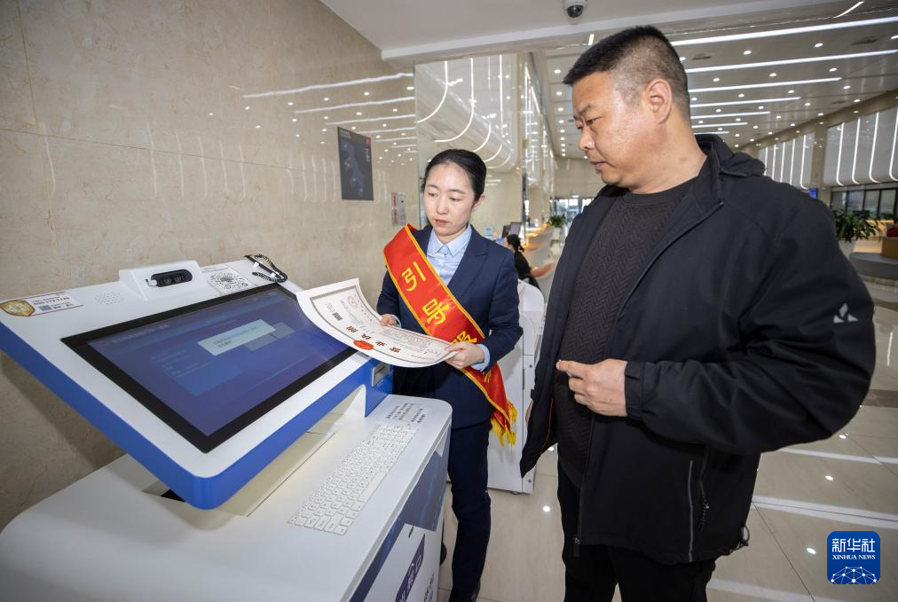 3月21日,在银川市审批服务管理局企业服务大厅,工作人员引导办事人员打印营业执照。
