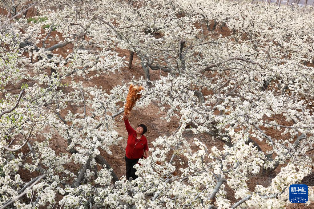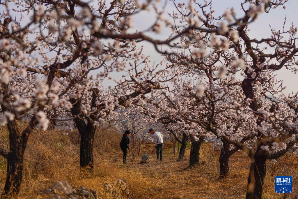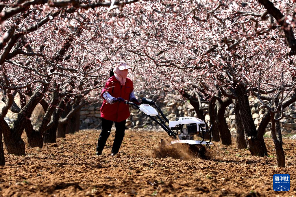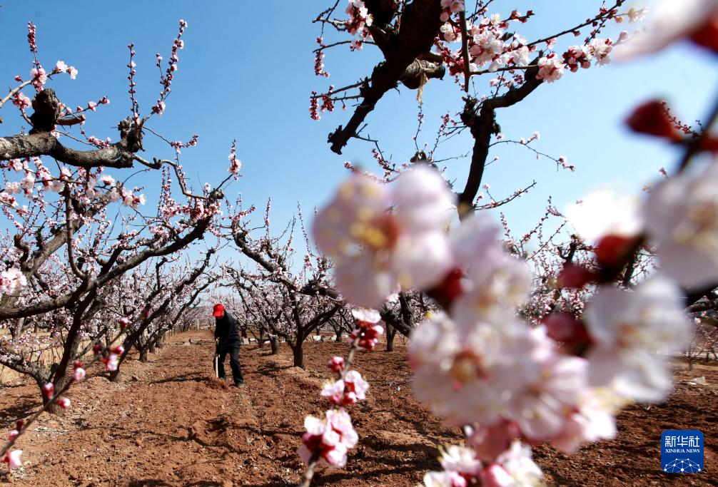 3月20日,山东省临沂市平邑县卞桥镇时家村村民在杏花园劳作。