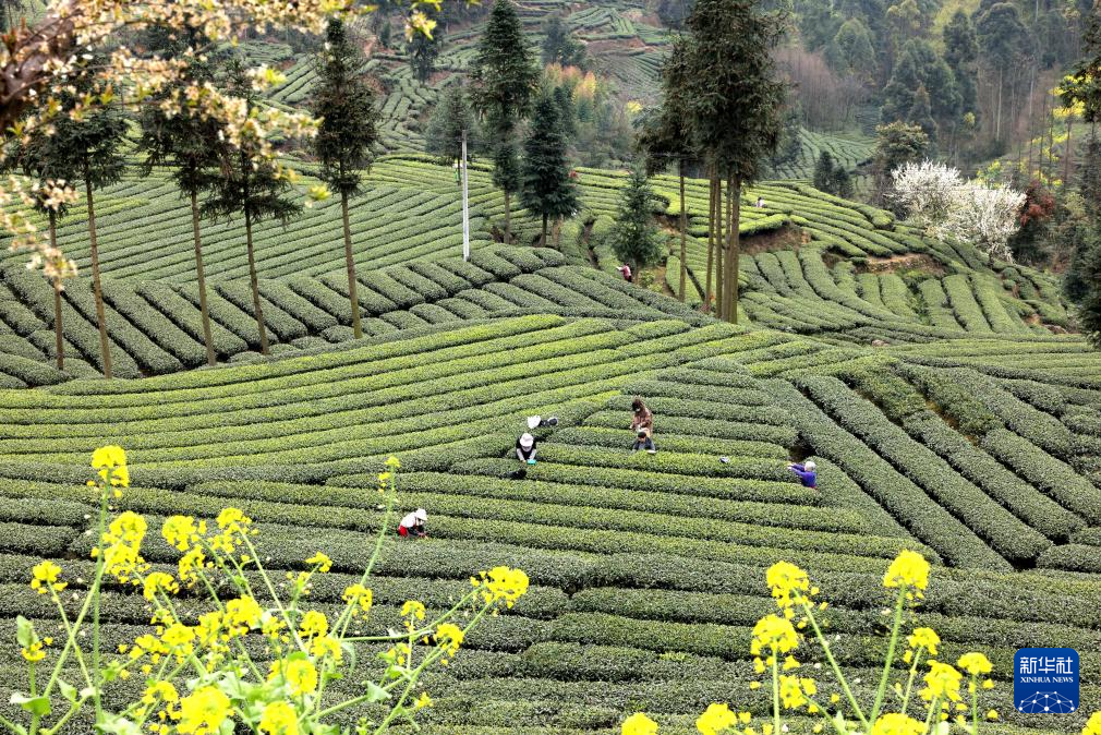 3月22日,四川省眉山市洪雅县青杠坪村茶农在采摘明前春茶。