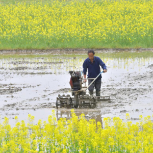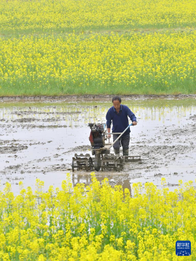 3月23日,在湖南省娄底市双峰县井字镇生机村,农民驾驶农机翻耕肥用油菜。