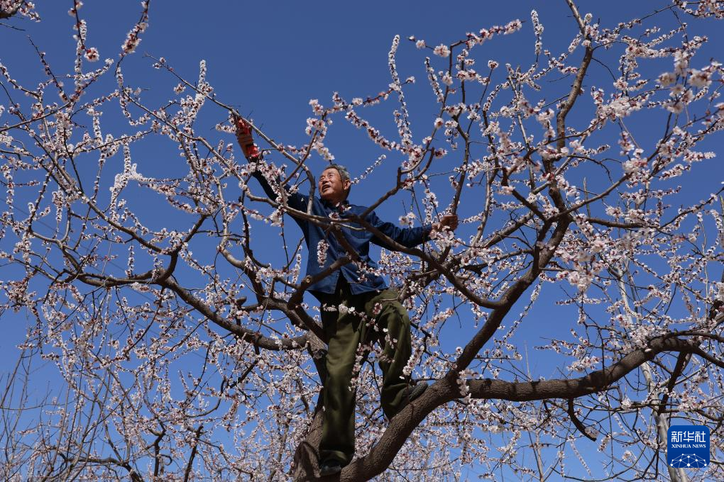 3月22日,河南省安阳市内黄县张庄村农民在为杏树疏花。