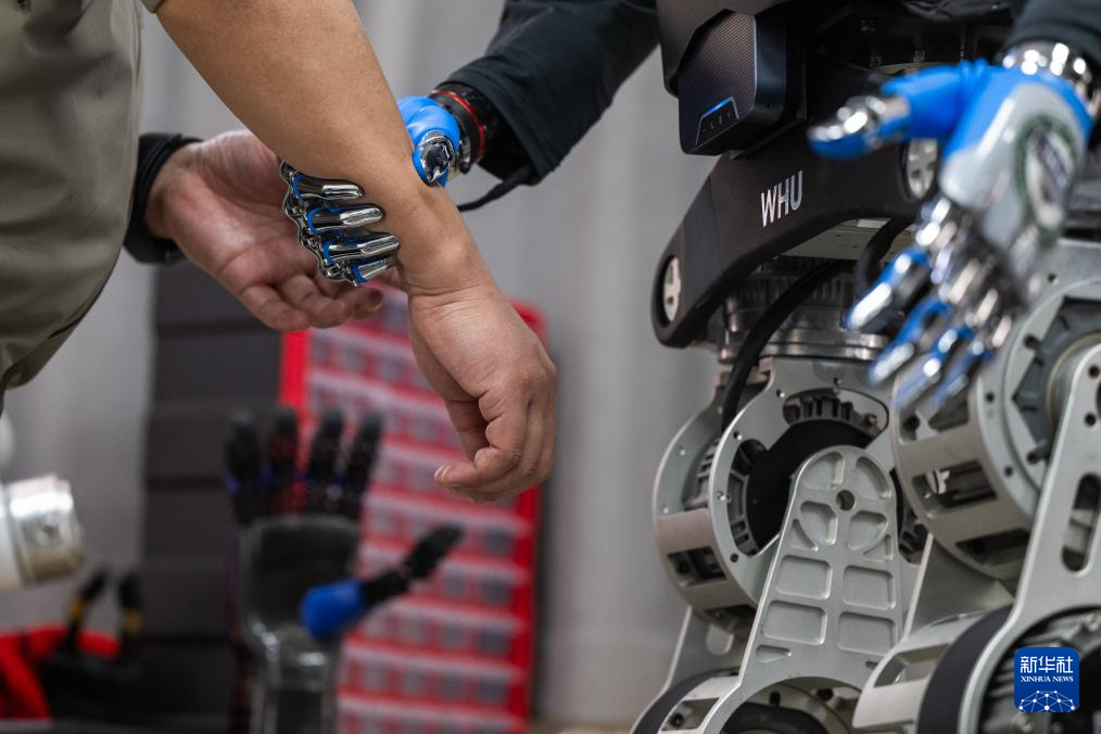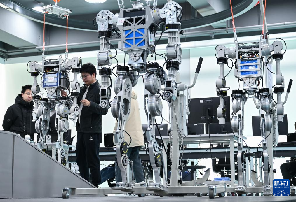 3月19日,在武汉大学机器人学习算法与软操作实验室内,研发团队在对“天问”人形机器人进行研发调试。