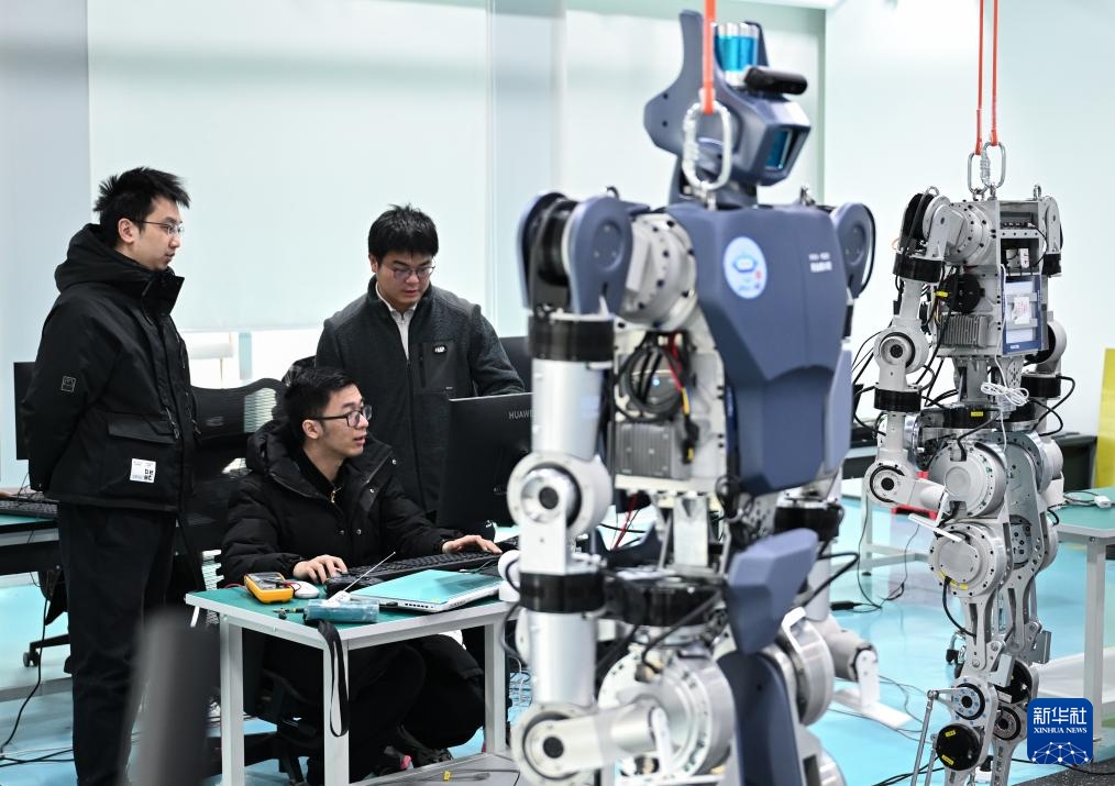 2月24日,在武汉格蓝若智能技术股份有限公司,研发团队成员在调试人形机器人。
