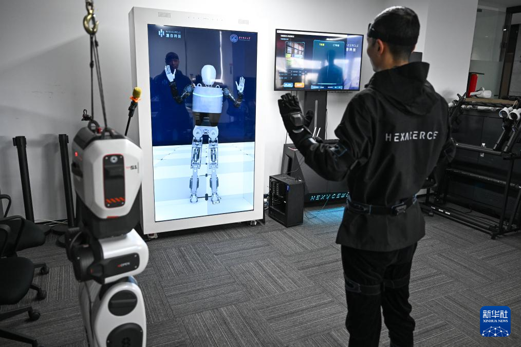 3月24日,在武汉灏存科技有限公司,研发团队成员在调试人形机器人运动神经中枢系统。