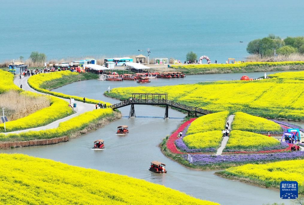 3月25日,游客在江苏省高邮市湖上花海景区赏花游玩(无人机照片)。