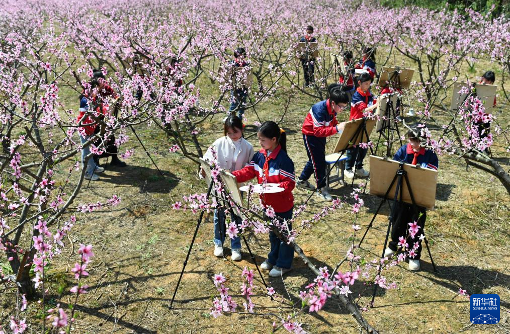 3月24日,在湖南省邵阳市洞口县黄桥镇石狮村,学生在桃花园里写生。