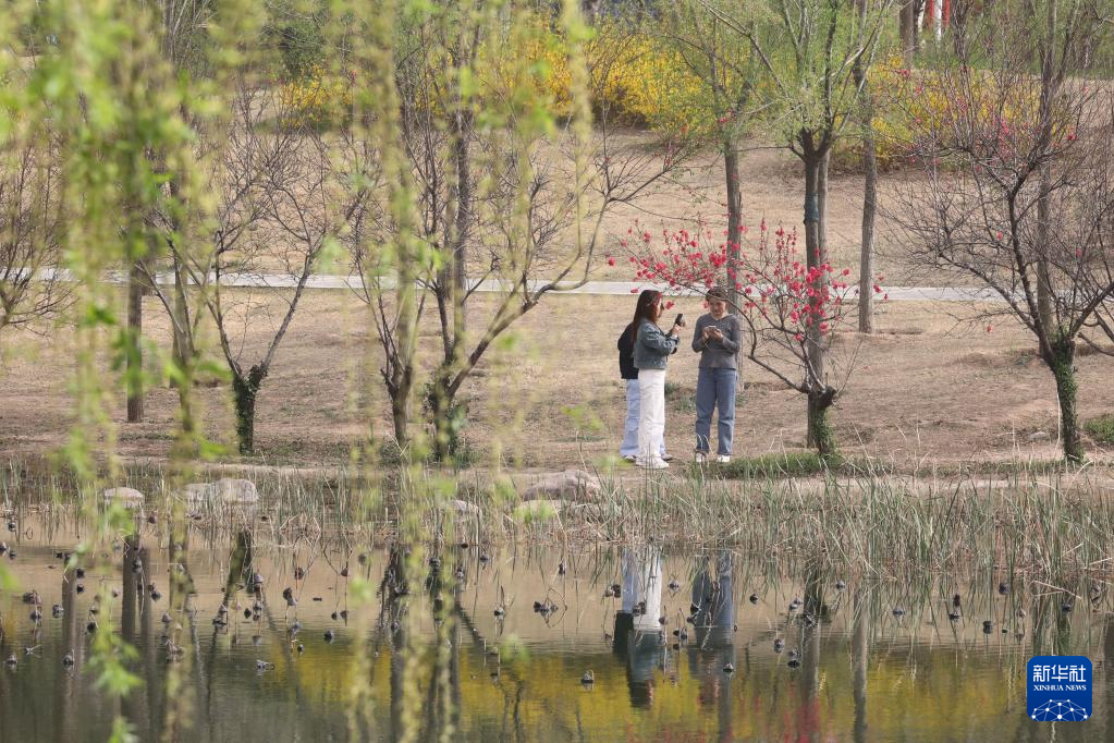 3月25日,游人在河北省石家庄市石津灌渠文化公园游玩。