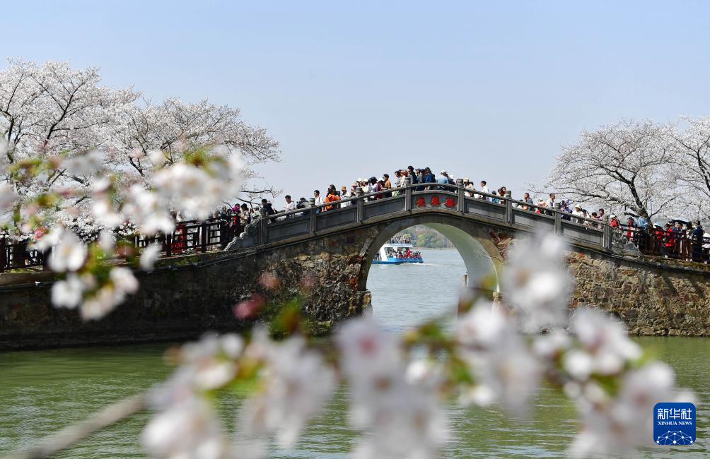 3月25日,游客在江苏无锡太湖鼋头渚景区赏樱游玩。