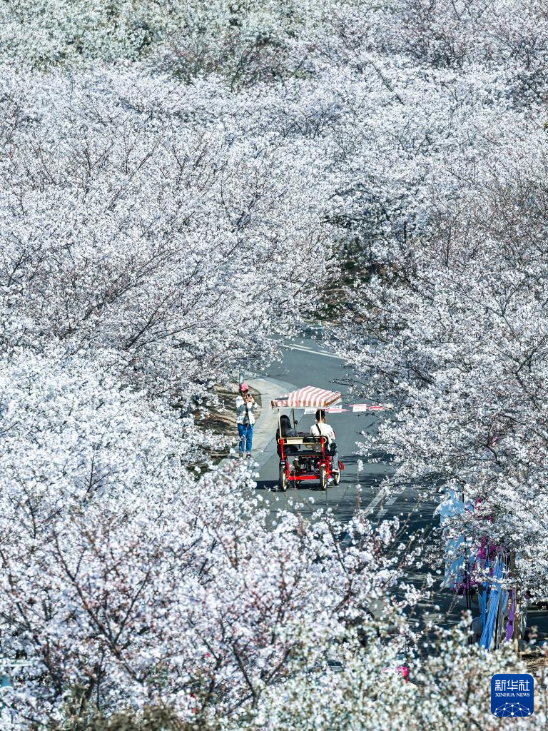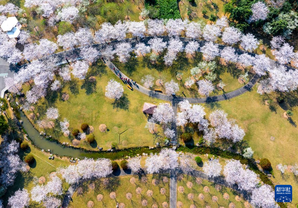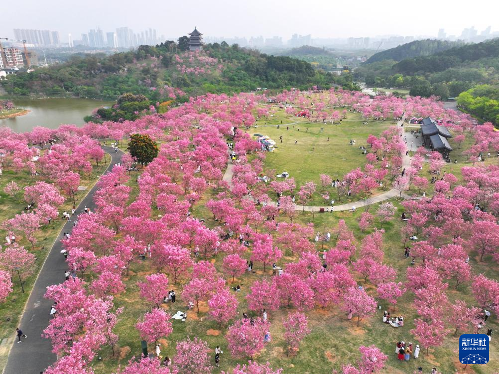3月25日,人们在广西南宁市青秀山风景区观赏樱花(无人机照片)。