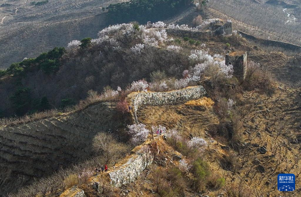 3月24日,游客在河北省遵化市境内的古长城游玩(无人机照片)。