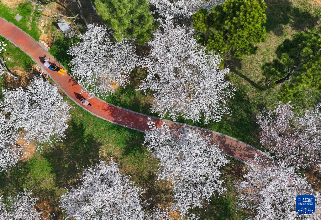 3月25日,游人在江苏连云港市花果山樱花大道观赏樱花(无人机照片)。