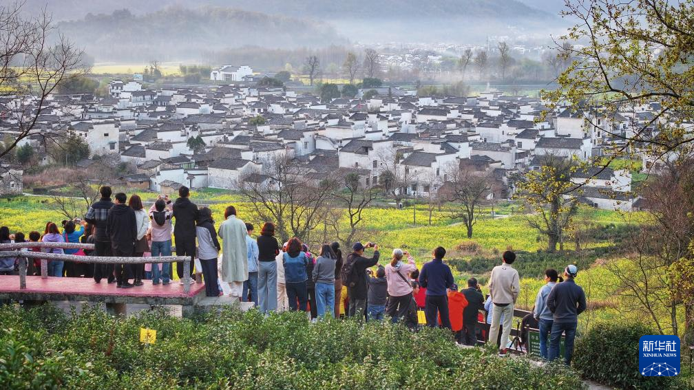 3月25日,游客在安徽省黄山市黟县宏村镇卢村拍摄油菜花田和徽派古民居(无人机照片)。